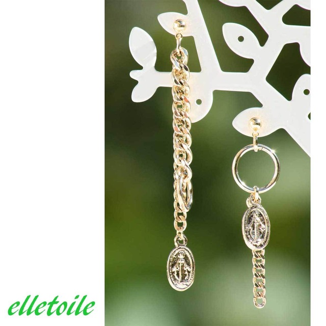 シルバー(color:gold) 左右非対称デザイン、アシンメトリーピアス。 オーバル型メダル、リング、チェーンでシンプルにまとめられ、クールなイメージです。ナチュラルな洋服にあわせても、きりっと引き締まったイメージのファッションになります。実物を見ていただくとシルバーの風合いが出ていますのでパッとみてクオリティー違いを感じます。愛らしさよりも洗練された大人のファッションを好まれる方に喜んで頂けるかと思います。プレゼント包装希望の方はお問合せ下さい。 公式サイト:https://elletolie-wedding-dress.jimdofree.com/ instagram ID: elletolie_bridal (制作シーンなどもアップしていくのでぜひフォローお願いします♪)
