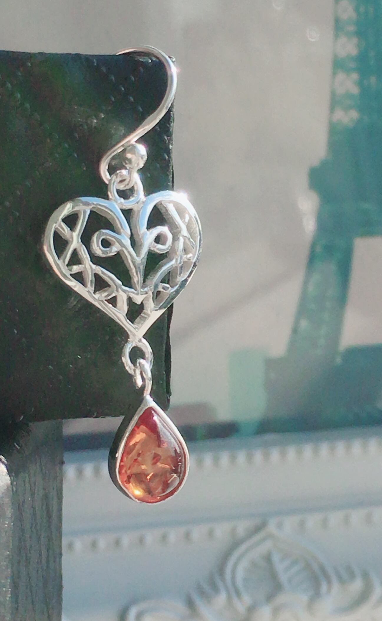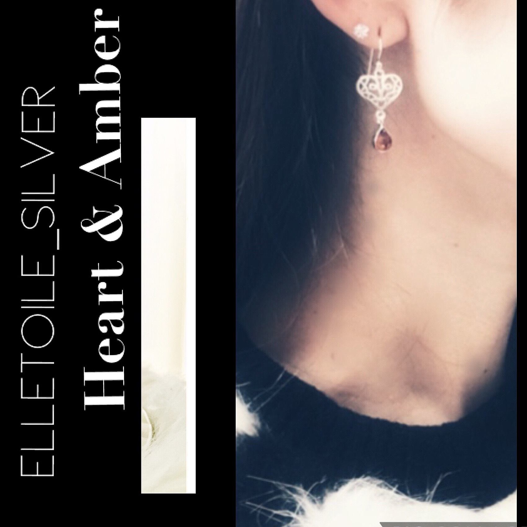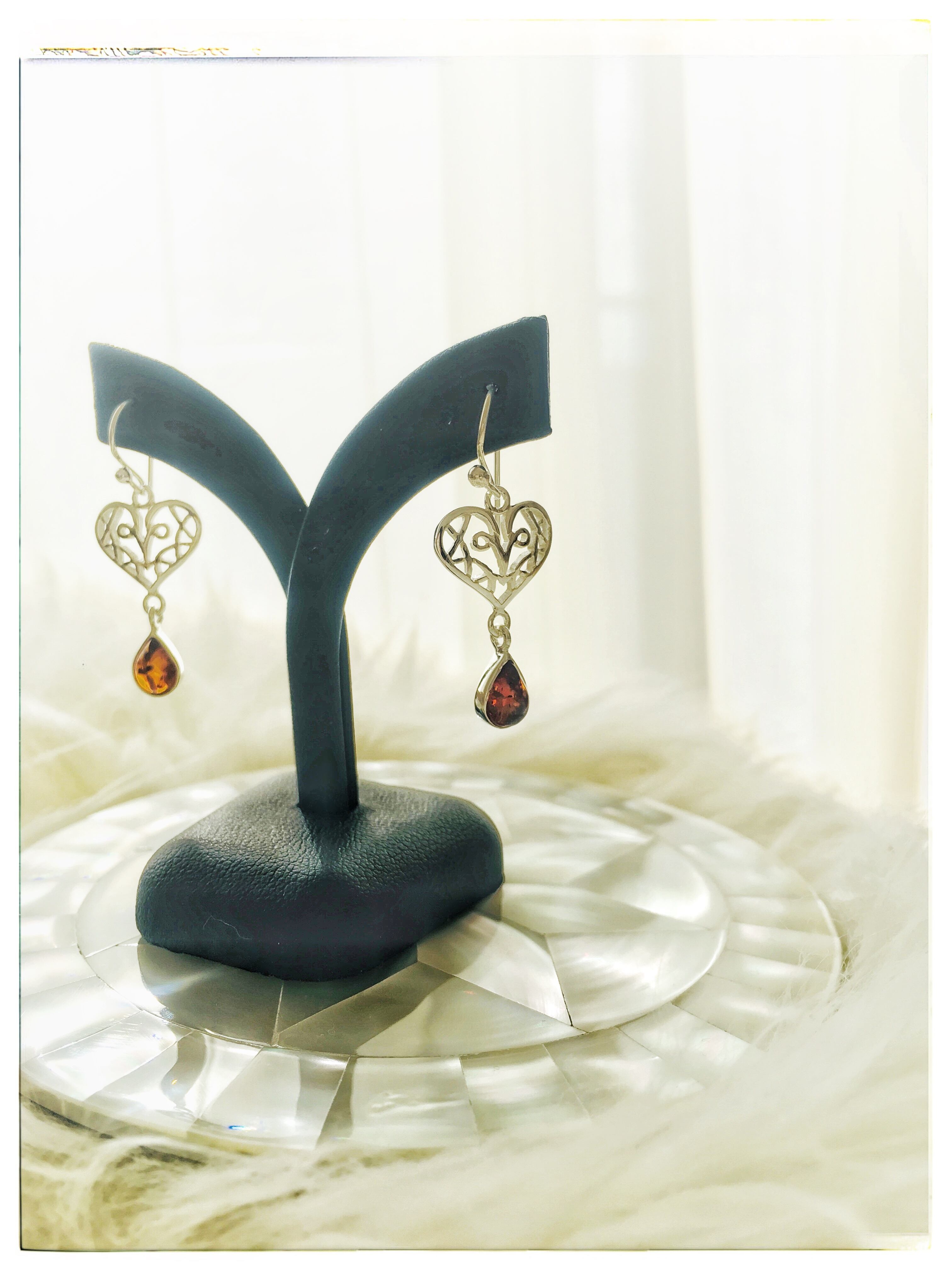 ハートモチーフのハンドメイドシルバーにドロップ型琥珀。エレガントな大人のハートアクセサリー。付けると揺れてより愛らしさが増します。